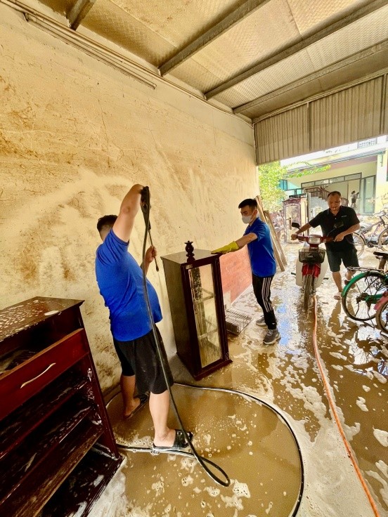 Đoàn viên Chi đoàn thanh niên NHNN Khu vực 5 hỗ trợ dọn dẹp cho các gia đình bị ảnh hưởng bởi cơn bảo